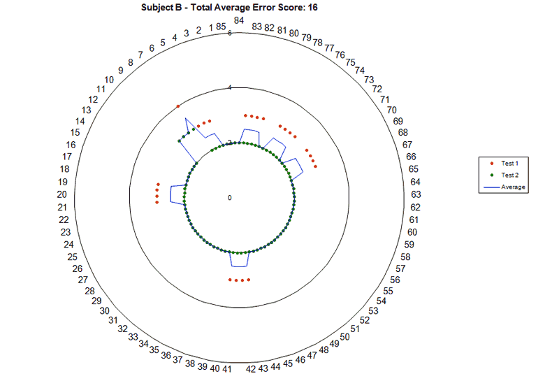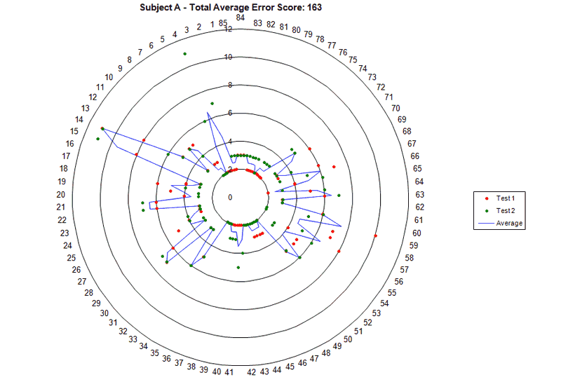 Notice the scale on the radius of the chart (the numbers labeling the concentric rings). My friend with good color vision never exceeds 4, while I go past 10. My two trials don’t even match each other in where I make mistakes, and if I did more trials it wouldn’t improve. My friend did better his second time through, which is normal for most people after they loosen up and get in to the test a little more.